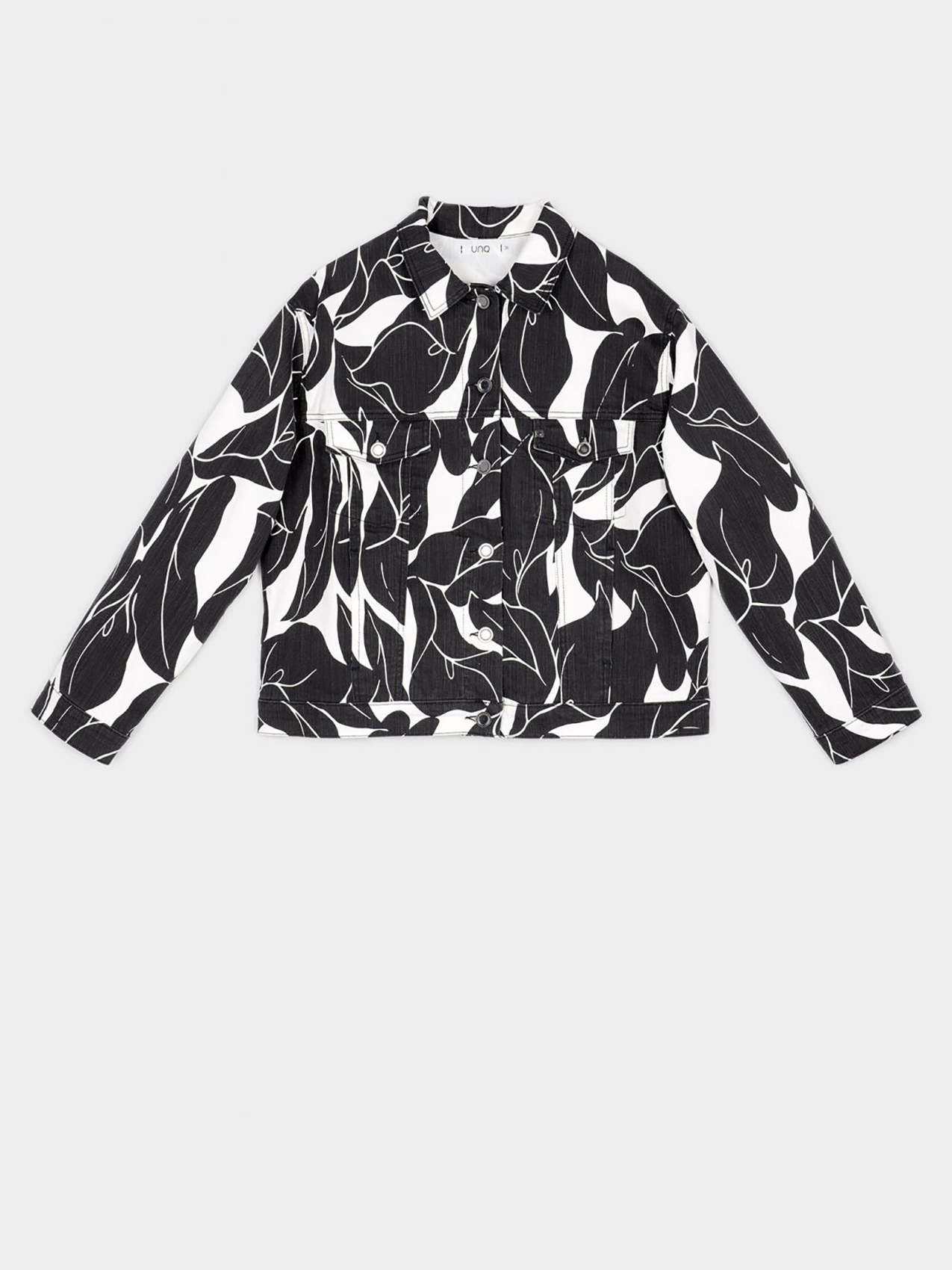 Джинсовка прямого кроя на пуговицах – всегда актуальная классика городского повседневного стиля. Контрастный тропический узор по всей поверхности изделия. Отложной рубашечный воротник, накладные карманы на груди, втачной рукав полной длины с манжетой на пуговице.