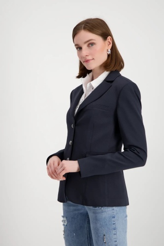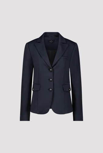 Жакет из эластичного материала с ребристой структурой, слегка приталенный. Воротник с лацканами. Ложный нагрудный карман и ложные карманы с клапанами. По центру планка с декоративными пуговицами.