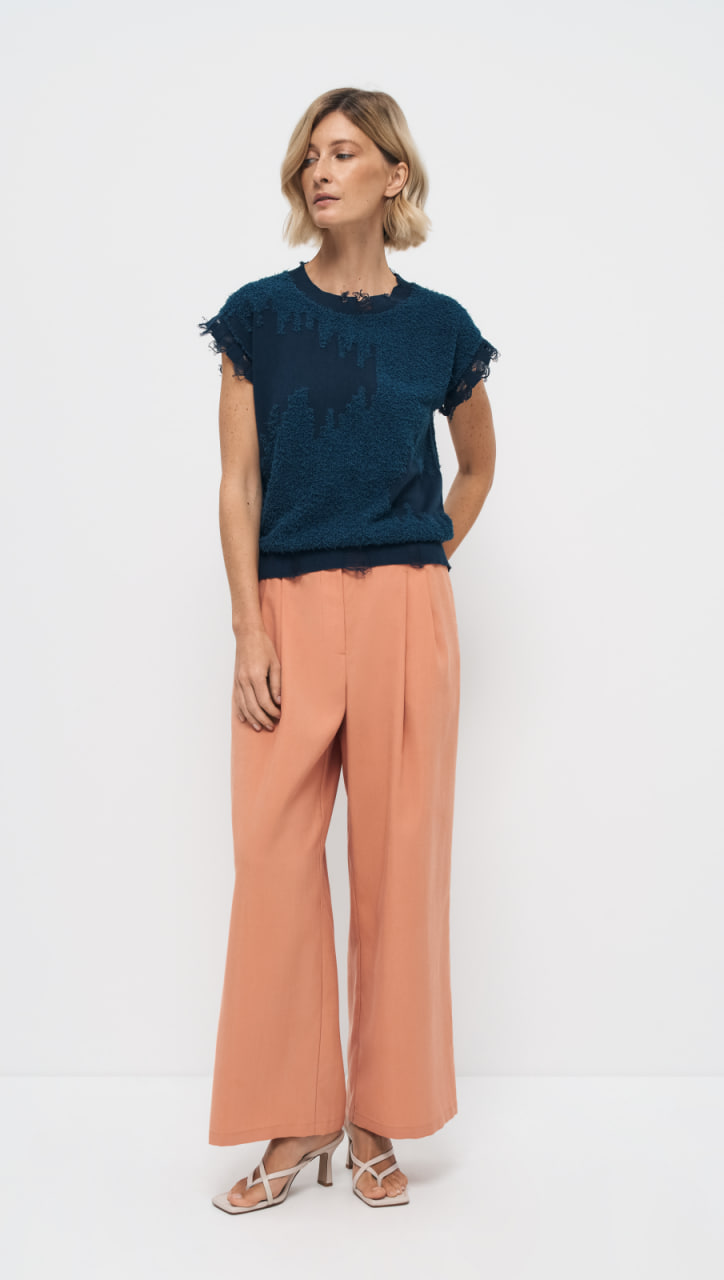 Жилет свободного прямого силуэта изготовлен из качественной смесовой хлопковой пряжи, обеспечивающей прочность и долговечность изделия. Жилет дополнен гранжевыми деталями, имитирующими распущенные протяжки по пройме и низу изделия, что придаёт базовой форме почти художественный вид. Цвет «синяя глубина» отлично сочетается с различными оттенками в комплектах.